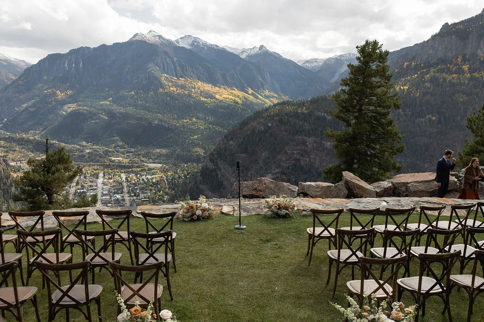As Hannah and Blake soaked in their first look, guests began arriving via TelluRides shuttles, winding their way up the mountain to Gold Mountain Ranch. The moment they stepped off, they were greeted by sweeping views and the soft sounds of acoustic music drifting through the ceremony space, instantly setting the tone for something truly special. It felt intimate, intentional, and like the mountains themselves were welcoming everyone in.