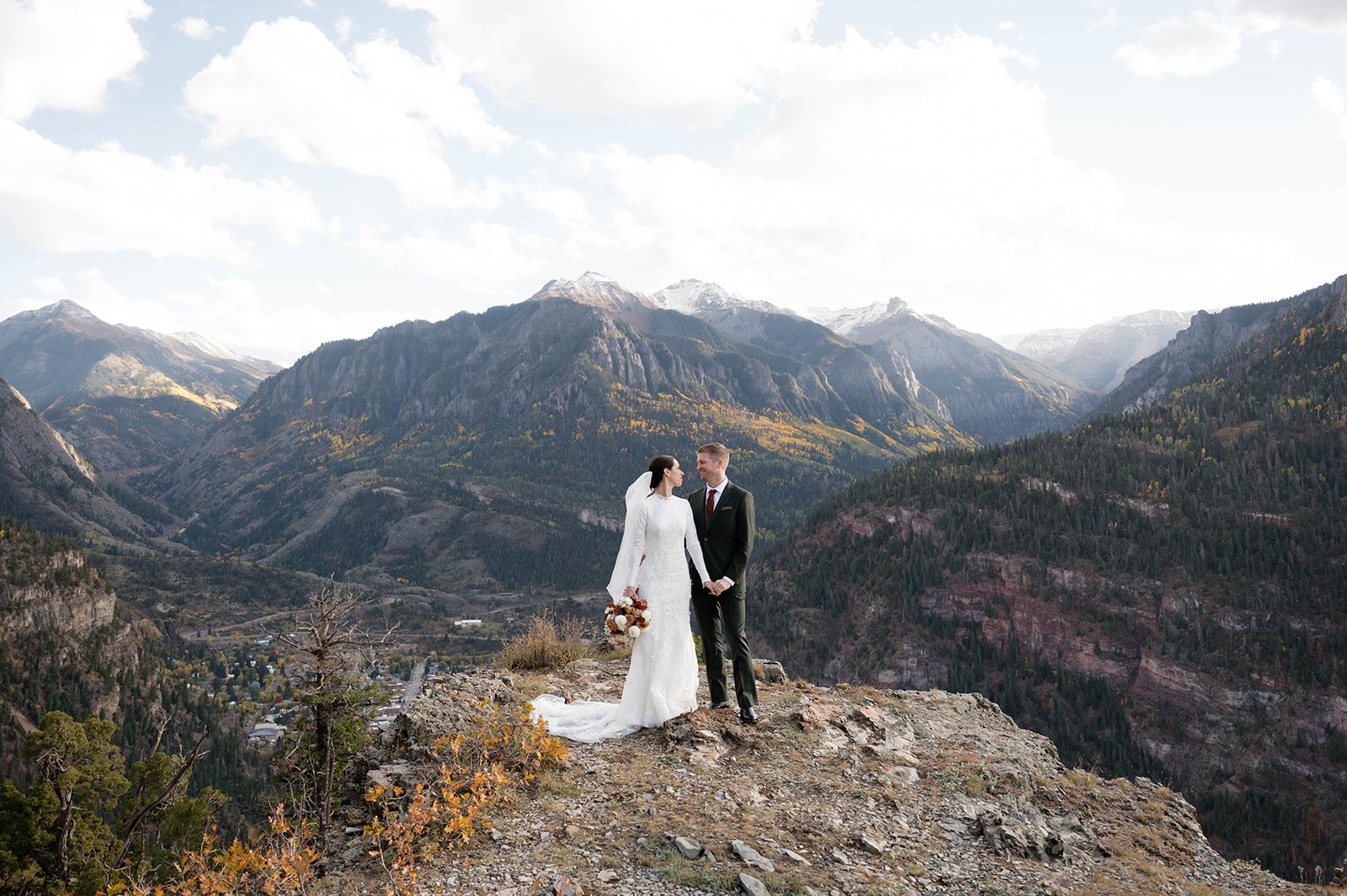 From there, Hannah made her way up the mountain to the Overlook House, where Blake was waiting for their first look. Tucked away above the valley, the Overlook felt like a private getaway just for the two of them, quiet, peaceful, and surrounded by sweeping San Juan views. When they finally saw each other for the first time, the world seemed to pause for a moment, just the two of them soaking it all in